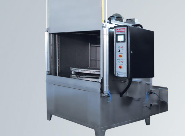 Lavadora automática con proceso de lavado por aspersión en caliente. Máquinas equipadas con plataforma giratoria accionada por motorreductor y puerta frontal de guillotina de apertura automática mediande cilindros neumáticos.